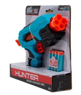 De BuzzBee Air Warriors Hunter is een compacte en stijlvolle blaster met een transparante oranje plungertube. Het pull-back primesysteem zorgt voor een soepele en gemakkelijke spanning van de veer. De blauwe blaster met zwarte details heeft een capaciteit voor 4 pijltjes en wordt geleverd met 4 Accu-Blast pijltjes.